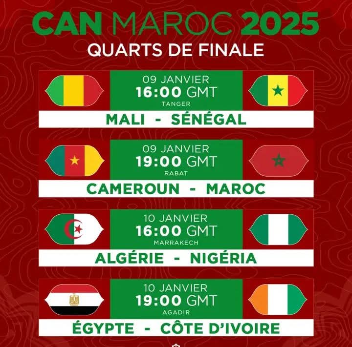 Les affiches des quarts de finale de la Coupe d’Afrique des Nations (CAN) 2025 sont désormais connues. La compétition entre dans sa phase décisive avec des confrontations de très haut niveau entre plusieurs favoris au titre.