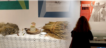 Les objets muséographiques de l’IFAN complètent le parcours : une arène reconstituée, des calebasses de voyance de Selbé Dom, des photos de Baye Niass, un tee-shirt de Mohamed Ndao Tyson, des tam-tam et d’autres éléments rituels plongent le visiteur dans l’univers culturel et spirituel de la discipline.