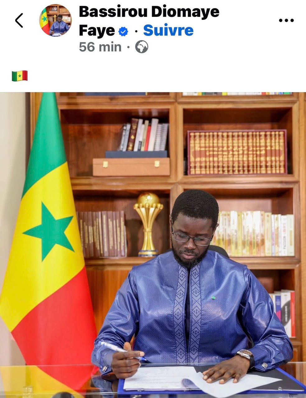 Le président de la République, Bassirou Diomaye Faye, s’affiche concentré à son bureau dans un cliché largement partagé sur les réseaux sociaux. Mais au-delà de l’image officielle, un détail attire immédiatement l’attention : le trophée de la Coupe d’Afrique des nations trône juste derrière lui.